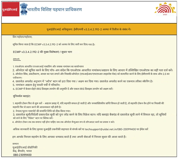 महत्वपूर्ण सुचना आधार सॉफ्टवेयर वर्जन 3.3.4.2/192-3 अपडेट करने के संबंध में | ‼️